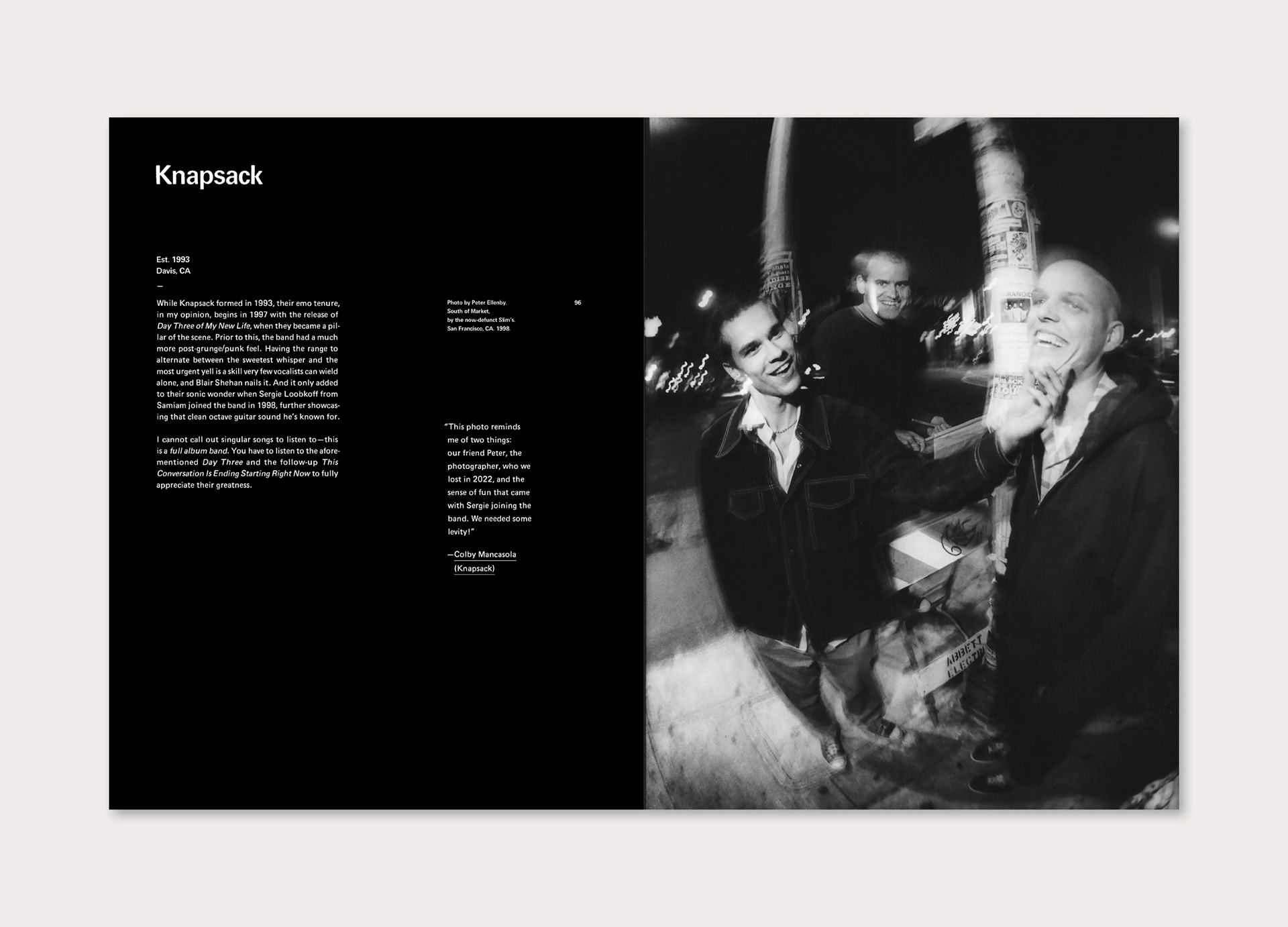 I collaborated closely with the author on interior layout, photo selection, and sequencing, communicating with the photo editor on image quality for print production. The photos are the hero of this book and they are featured at a diversity of scales, conveying the raw energy of the emo scene. The middle section of this book, titled “Everything & Everyone,” takes on the DIY ethos of emo, featuring candid off-stage shots that are arranged in a yearbook-esque layout, interspersed with essays and bite-sized narratives.